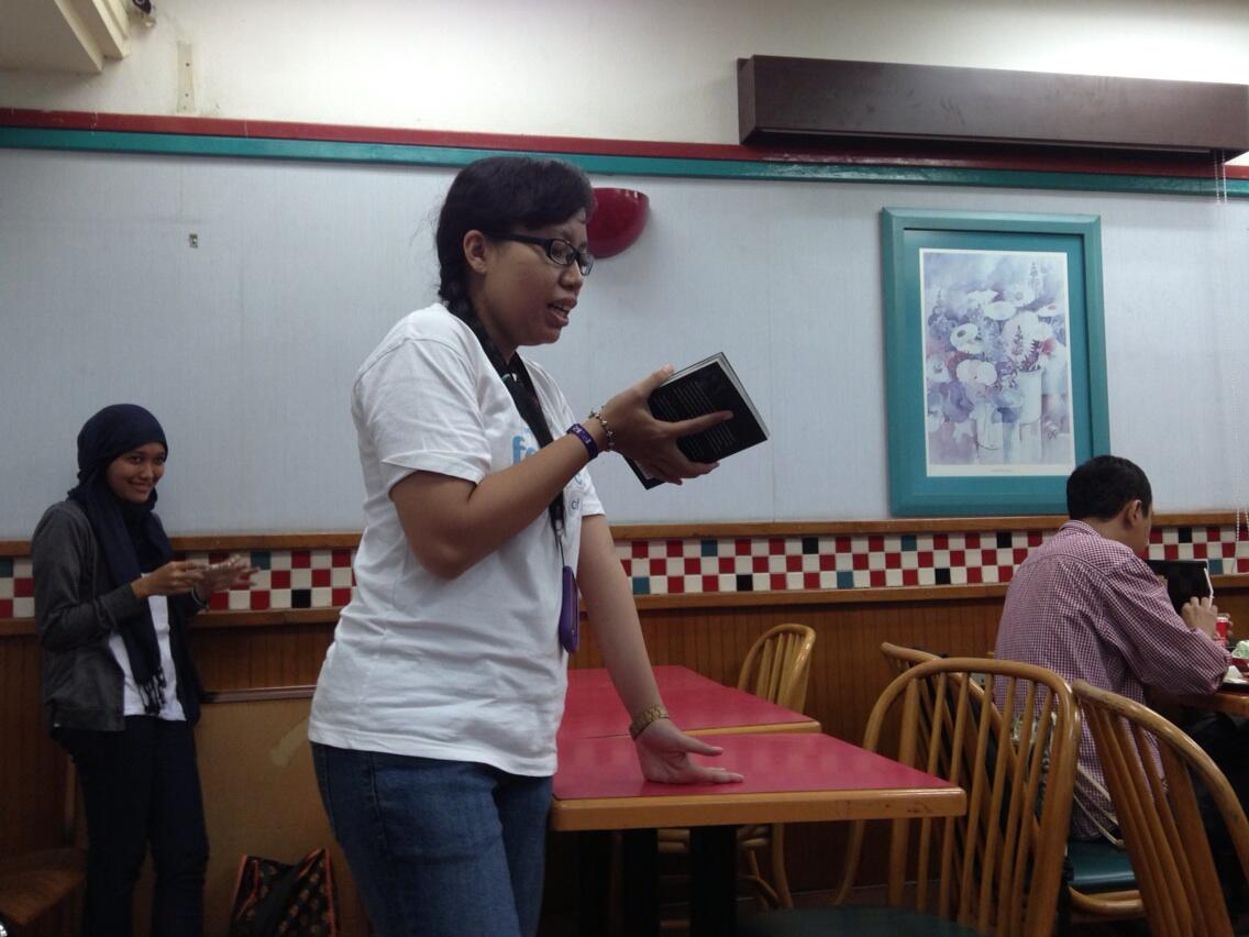 Yap, lanjut. Acara udah dimulai, tapi belum semua yang hadir. Sesi pertama langsung deh 3 penulis yang diundang (termasuk gue) dipersilahkan untuk ngomong di depan orang-orang. Pertama, mbak Ayumi maju. Dia ngomongin tentang bukunya gitu. Semua mendengarkan.